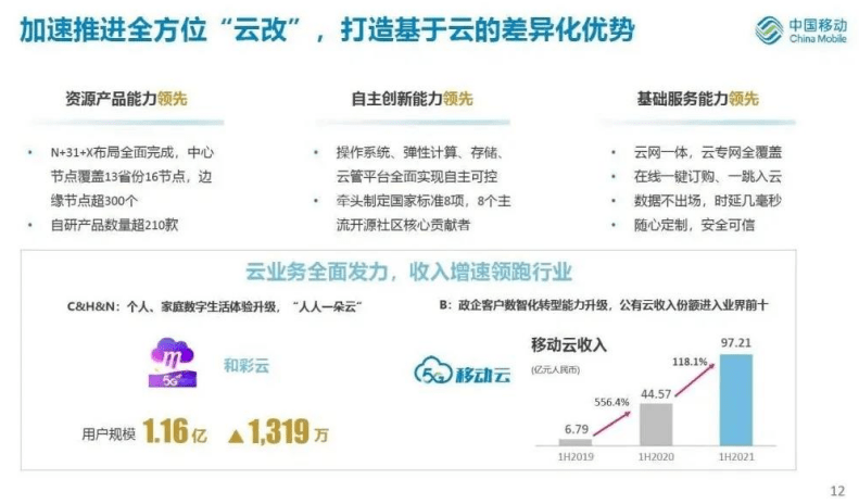 8月12日,中国移动发布了2021年中期业绩:2021上半年,营收人民币4436亿元,同比增长13.8%。其中,移动云收入达到人民币97亿元,同比增长118.1%,超过2020年全年收入,公有云收入份额进入业界前十行列。