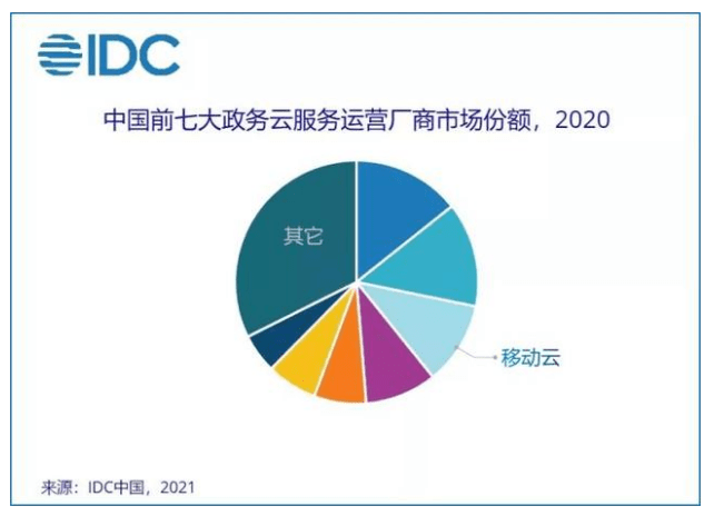 目前,中国移动已为14个省级政府、100多个地市级政府提供政务云平台服务。《2020年政务云服务运营市场研究报告》显示,移动云已跻身前列,占据市场份额第三。